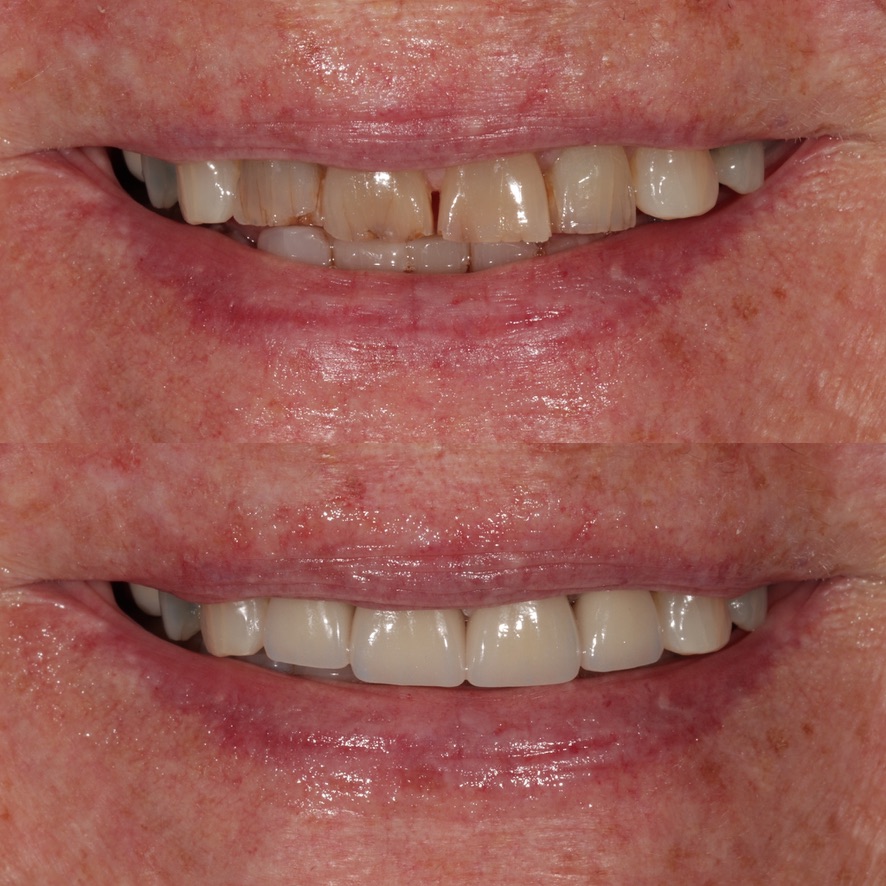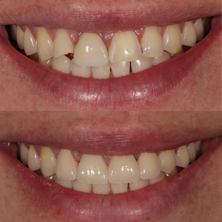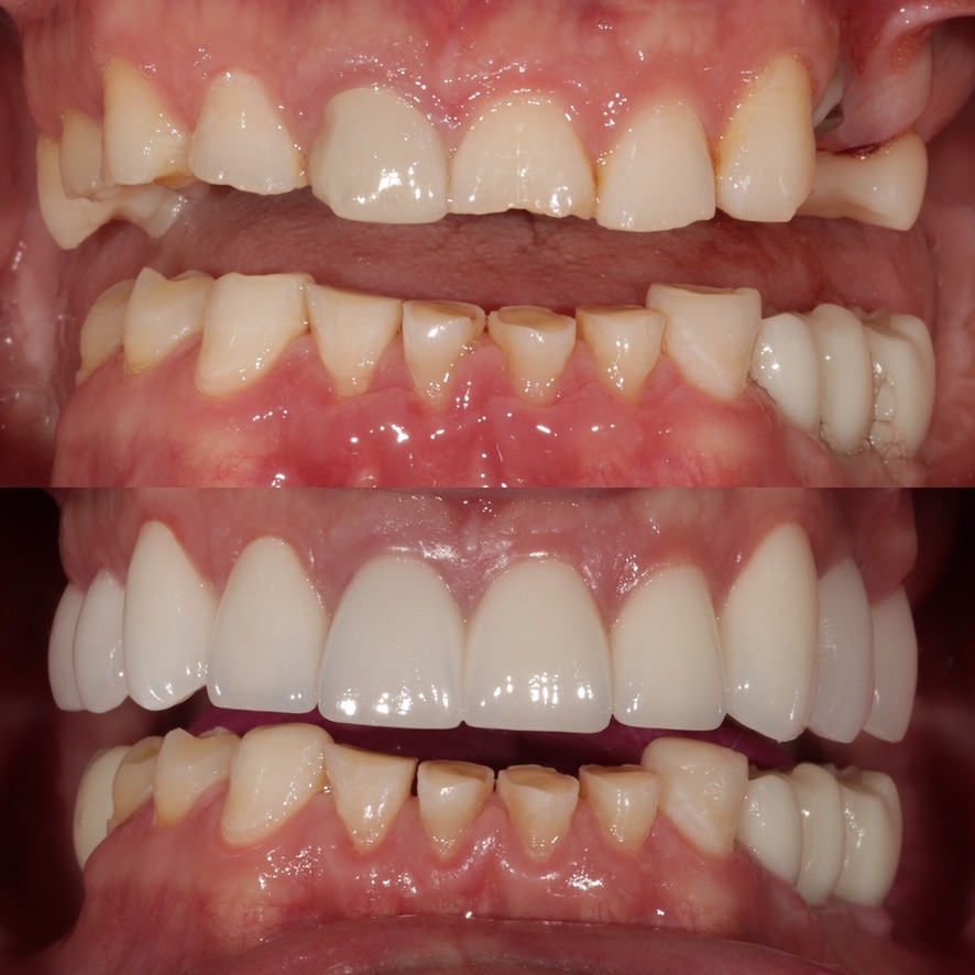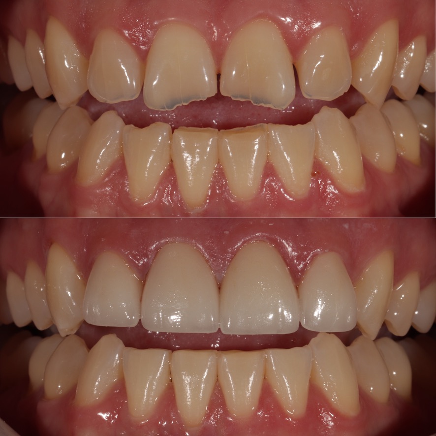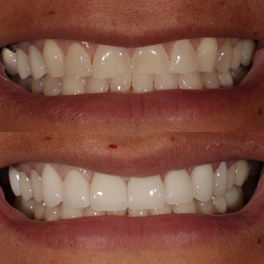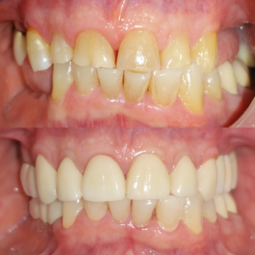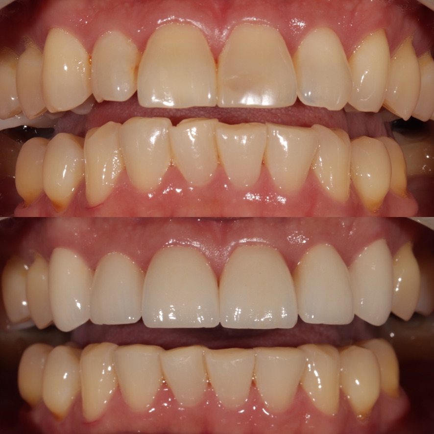 6 upper veneers/crowns, enameloplasty on the lower teeth to even out incisal edges