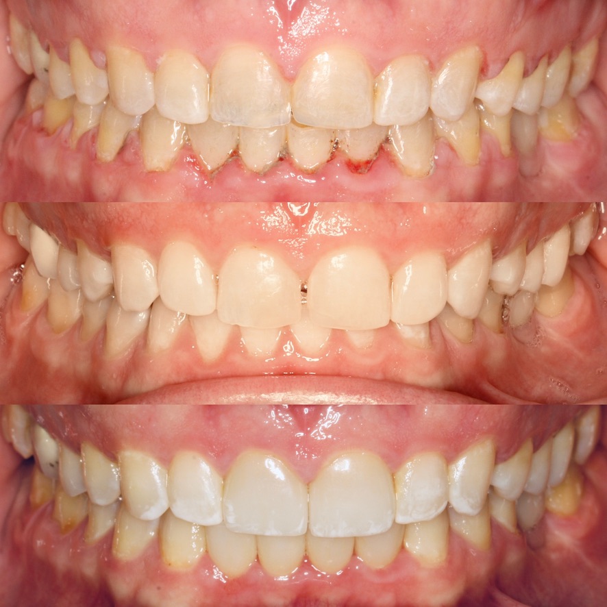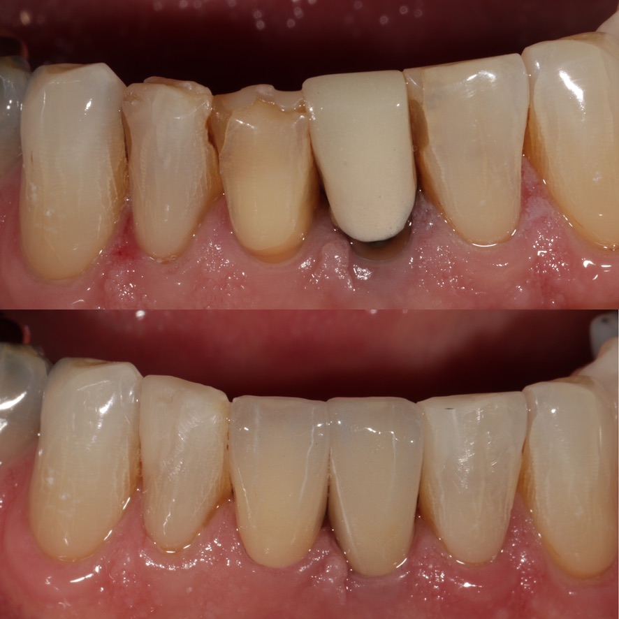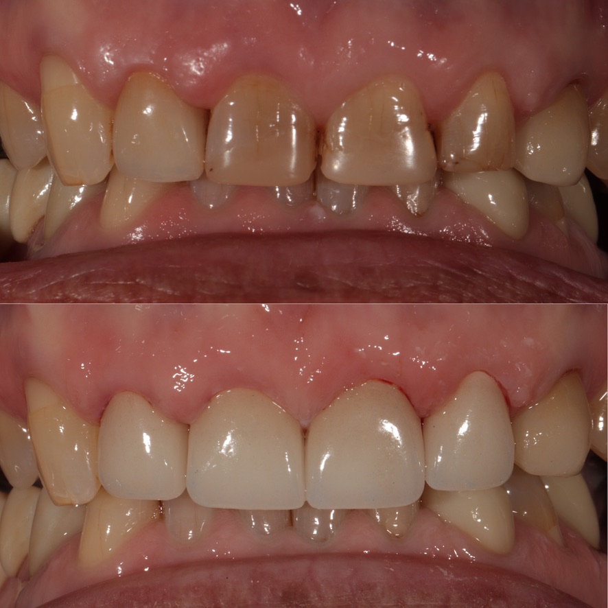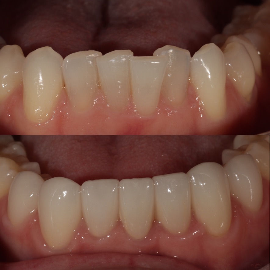 Extraction of lower anterior tooth, orthodontics to close space, 6 lower veneers
